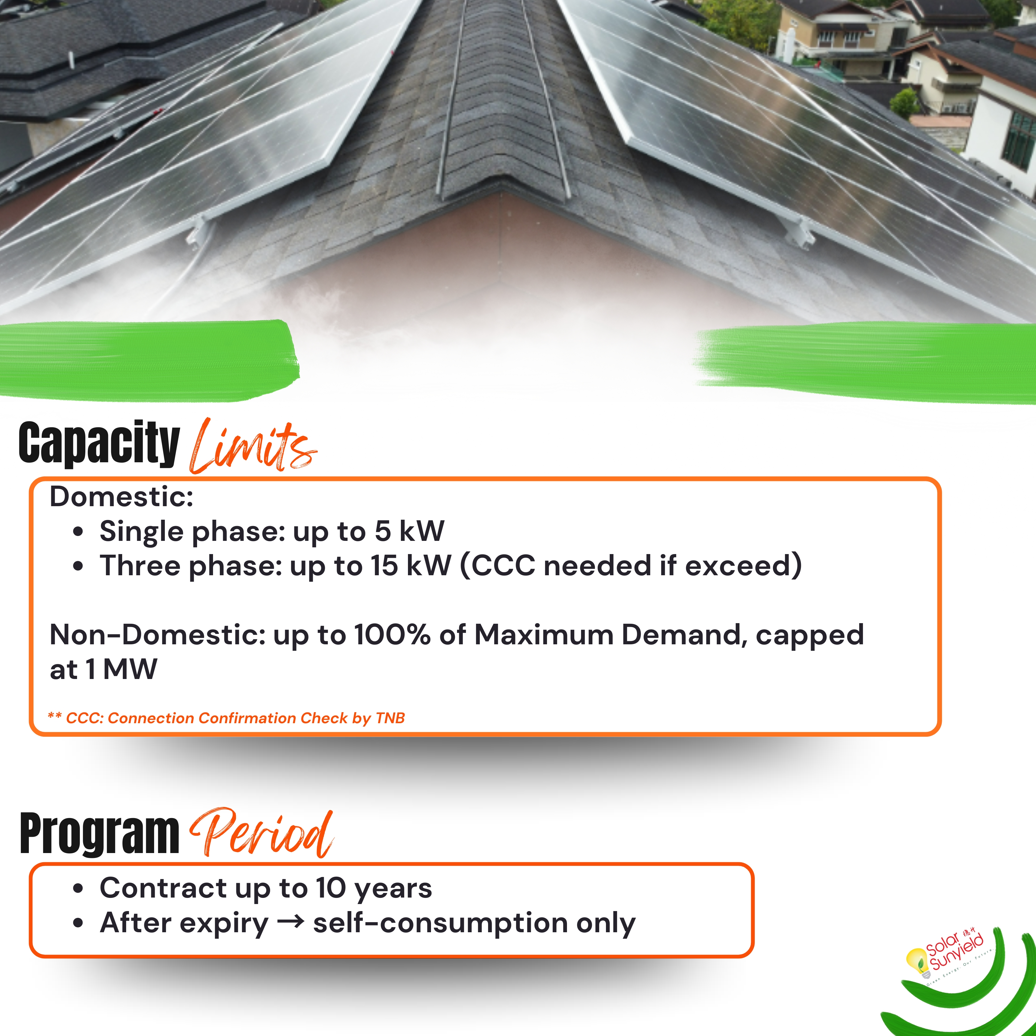 Think of it as generating your own clean energy while still staying connected to Tenaga Nasional Berhad (TNB) for backup and export opportunities.