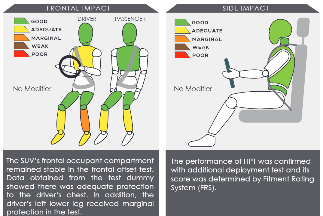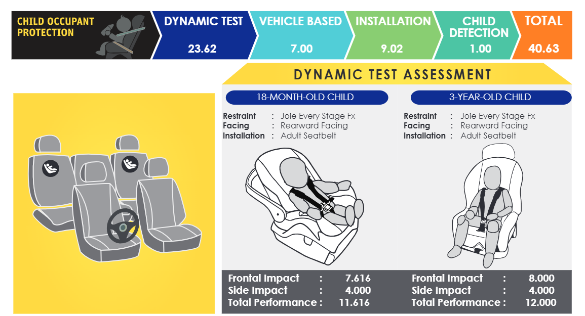 The SUV weighs 1,870 kg and performed very well in all safety tests. It scored 37.17 out of 40 points for Adult Occupant Protection, 15.94 out of 20 points for Child Occupant Protection, 17.14 out of 20 points for Safety Assist, and 16.25 out of 20 points for Motorcycle Safety.