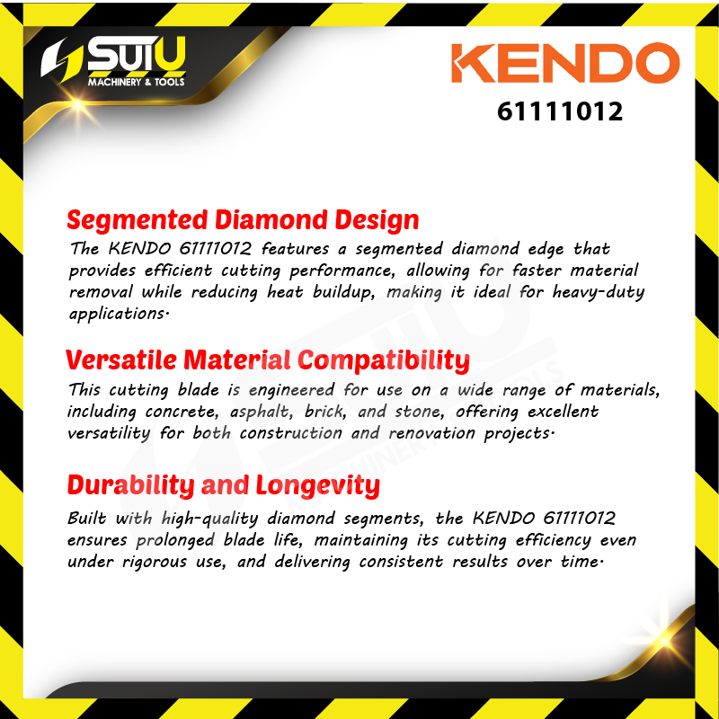 - The KENDO 61111012 features a segmented diamond edge that provides efficient cutting performance,allowing for faster material removal while reducing heat buildup,making it ideal for heavy-duty applications
