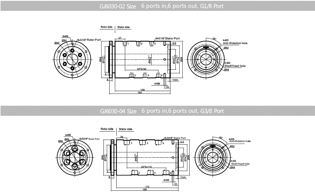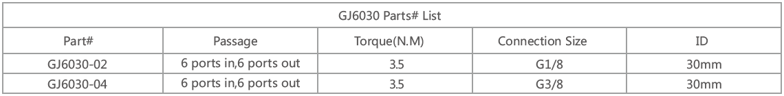 GJ6030 is 2 passages through bore rotary union with bore size 30mm, supporting connection size G1/8 and G3/8.
