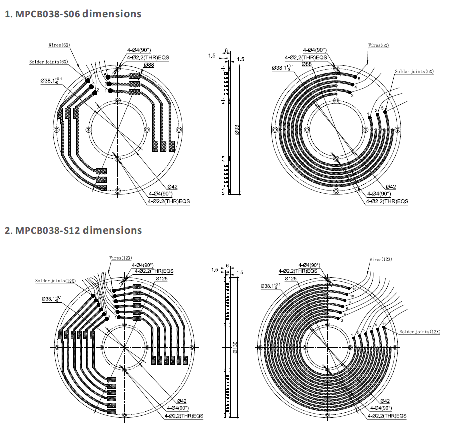MPCB038 ultrathin pancake series slip ring,adopt PCB substrate, thickess can up to 5.8 mm, which made of super hard gold plating, super thick copper foil process, maximum current can up to 10A,color-coded lead wires are used on both the stator and rotor for simplified electrical conenctors.