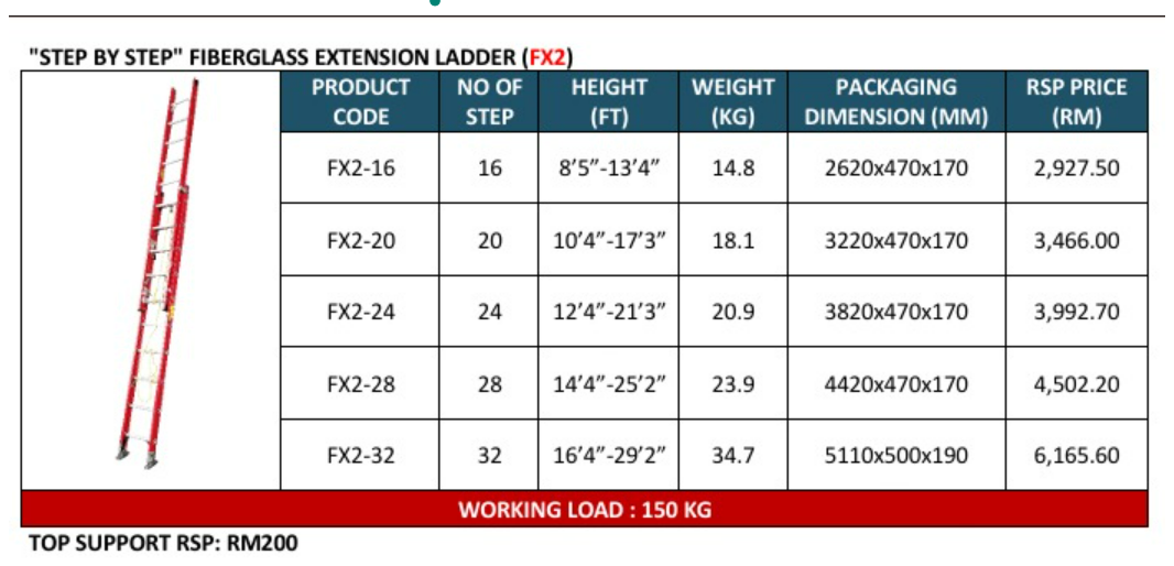 FX2-16 (16-STEP) ''STEP-BY-STEP'' FIBERGLASS EXTENSION LADDER (H=8'5''-13'4'')(14.8KG)(WORKING LOAD=150KG)