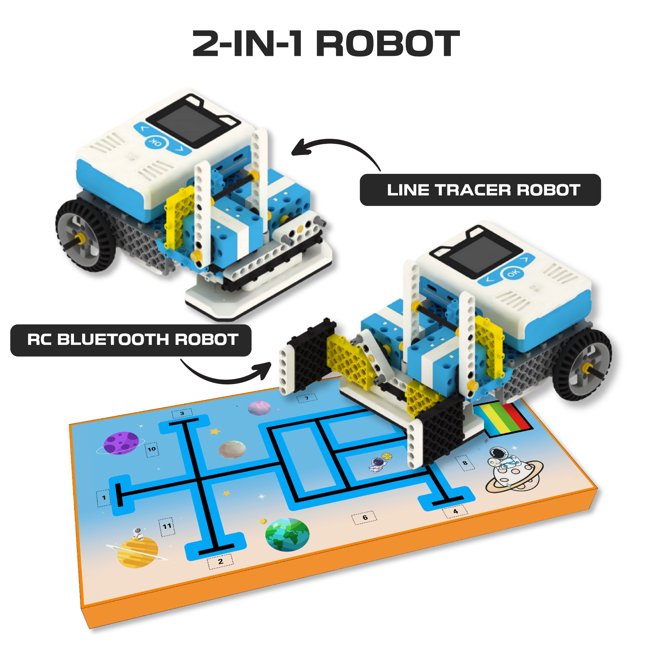 Wandering Planet II Kits comes with available functions, including 1 Codespark 2 Mainboard, 2 Encoder Motors, 2 Servo Motors, 1 Line Tracer Board, a Remote Control, as well as additional function available for Bluetooth control via the Remote Control. The robot is able to perform several variations to meet the competition task, such as,
