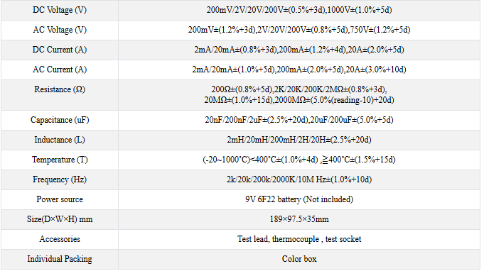 Extra functions: continuity with beeper, diode test, data hold, auto power off, low battery indication,