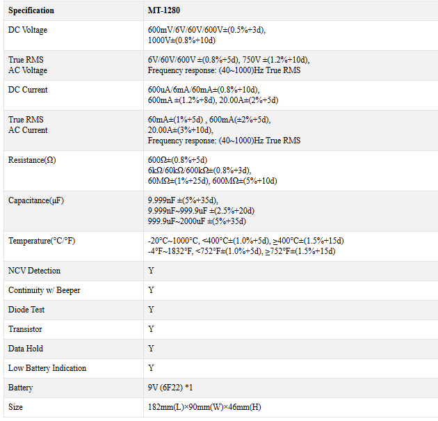 Extra functions:NCV detection, °C/°F test, Continuity with beeper, Diode test,