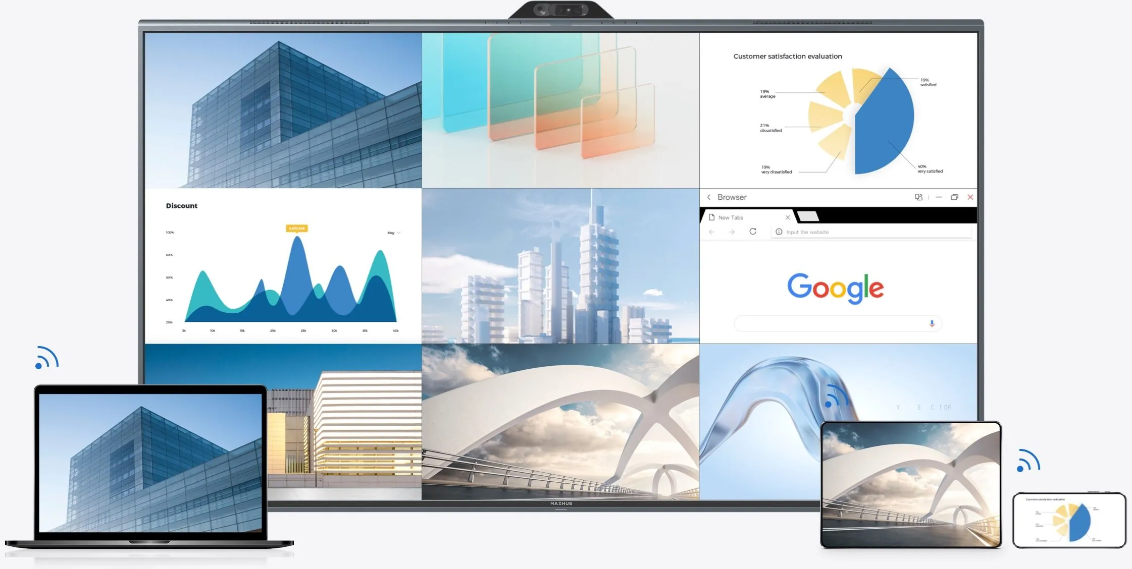 The MAXHUB V6 T Series delivers a sense of luxury with its modern workspace aesthetic and 95% screen-to-body ratio. The all-in-one display integrates camera, microphone, speaker, and touch panel. You can start the meeting right after plugging in the power supply.