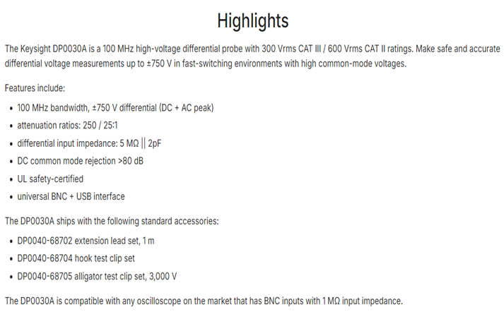 KEYSIGHT DP0030A High-Voltage Differential Probe, 100 MHz, 750 V