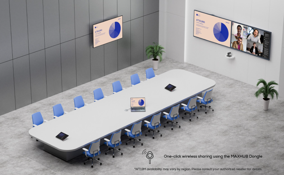 The new bundle facilitates a seamless dual screen display for meeting spaces. Easily initiate wireless content sharing with a single click using the MAXHUB Wireless Dongle, or enjoy exclusive 4K sharing via wired connections.