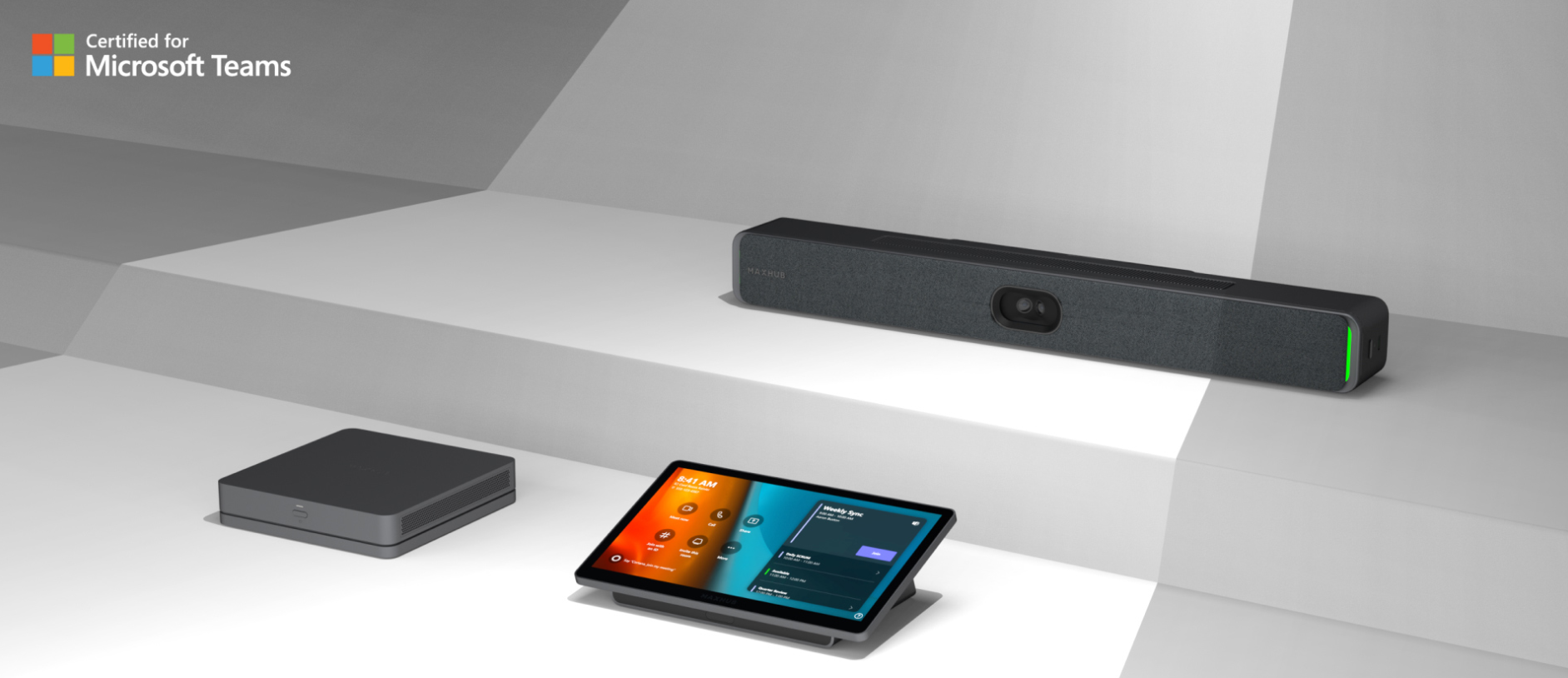 A complete Teams Rooms kit with mini-PC, touch console, and 100MP dual-lens videobar for small to medium meeting spaces.