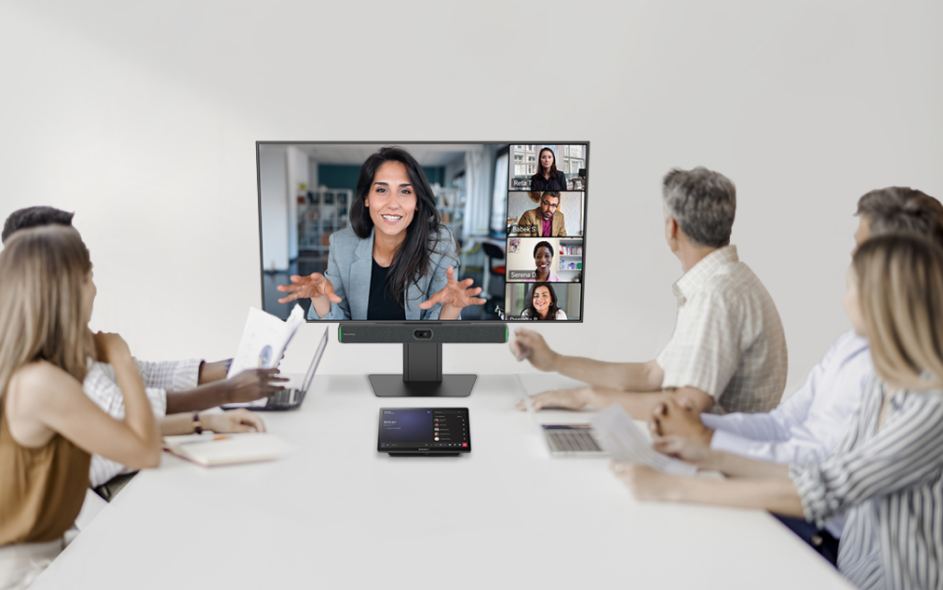 A PLUG-AND-PLAY TEAMS USB VIDEOBAR WITH A 100MP DUAL-LENS CAMERA SYSTEM