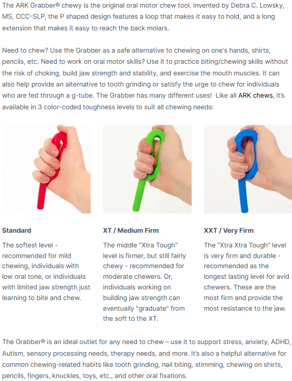 ARK's Grabber® is the original oral motor chew tool. Invented by Debra C. Lowsky, MS, CCC-SLP, the P shaped design features a loop that makes it easy to hold,