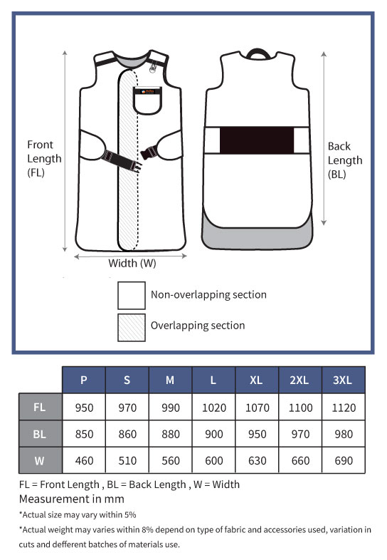 Wrap around, full-body protection coat style garment for MAXIMUM PROTECTION. Distributes weight between shoulders and hips. 0.35/0.5mmPb equivalency protection front. Velcro / Buckle closure. Generous armholes for EZ-fit.