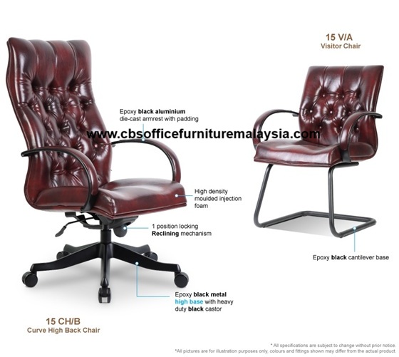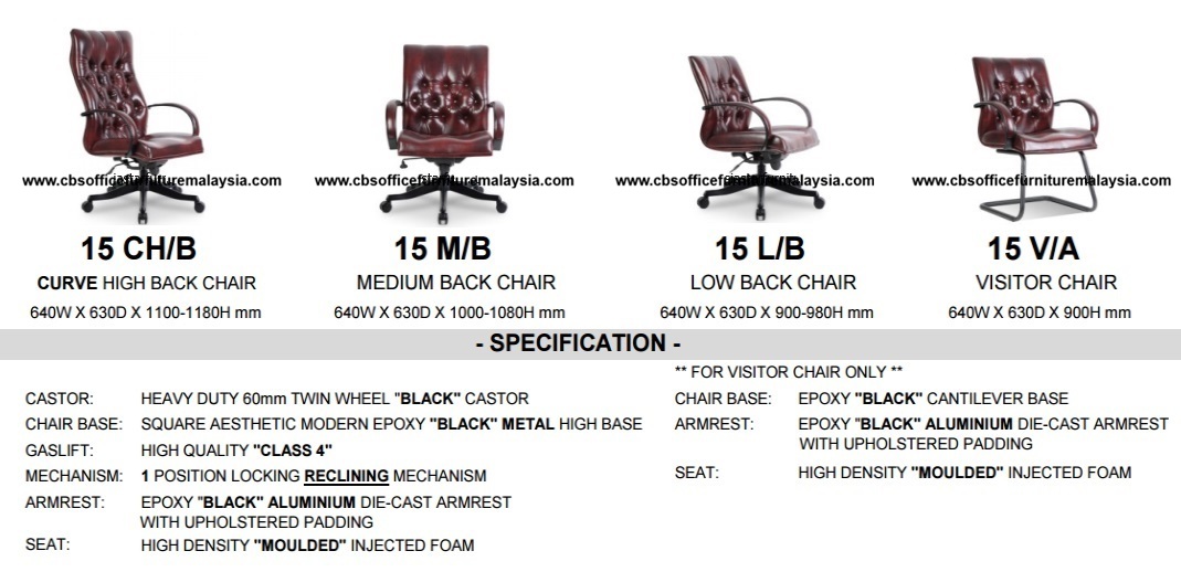 Upgrade your workspace in Kuantan & Pahang with the Classicor 15 Chesterfield Director Office Chair. Featuring high-density foam and premium PU leather, this executive chair offers superior ergonomic comfort and a classic authoritative look. Available for fast delivery by Cahaya Bintang Store.''