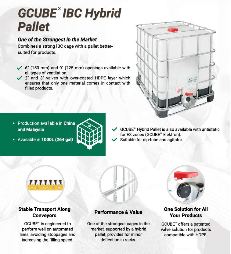 The IBC TANK Hybrid Pallet is a high-performance industrial container designed for safe storage, transportation, and handling of liquids and chemicals. Combining the advantages of an Intermediate Bulk Container (IBC) with a robust hybrid pallet, the GCUBE ensures maximum strength, stability, and reliability for industrial operations.