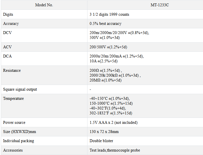 Extra functions: backlight, data hold, low battery indication, overload protection indication