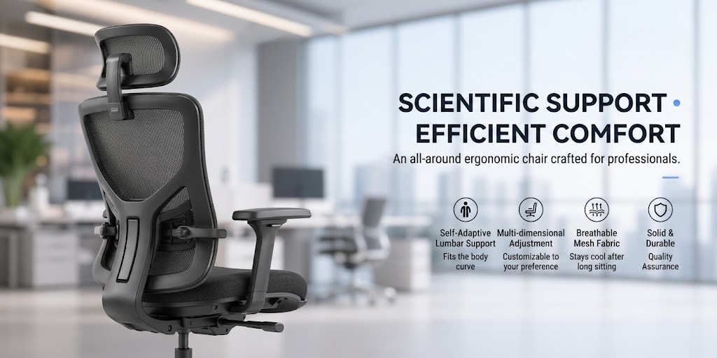 Pejabat moden, kerusi ergonomik di hadapan, latar kabur, gaya iklan korporat.