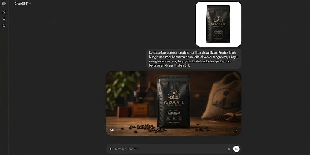 “Berdasarkan gambar produk, hasilkan visual iklan. Produk ialah bungkusan kopi berwarna hitam diletakkan di tengah meja kayu, menghadap kamera, logo jelas kelihatan, beberapa biji kopi bertaburan di sisi. Nisbah 2:1.”