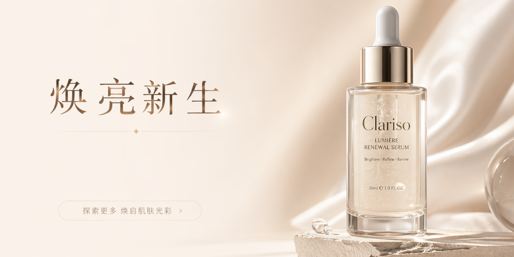 Prompt: Hasilkan visual iklan premium penjagaan kulit, sebotol serum di kanan memenuhi 40%, latar beige cerah, gaya fotografi komersial mewah, cahaya lembut, nisbah 2:1, tajuk atas “Radiant Renewal”, ruang butang bawah, komposisi iklan majalah.