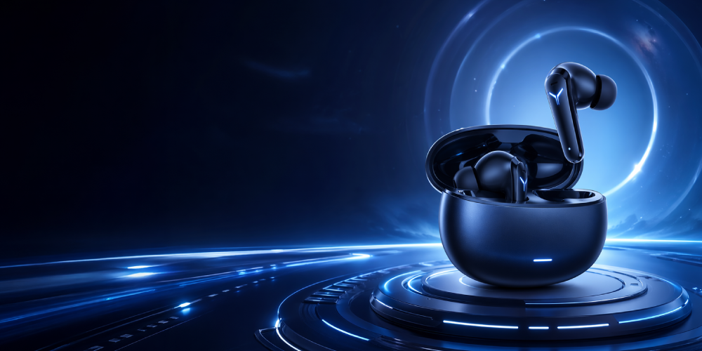 Produk earbud Bluetooth, di kanan, gaya teknologi futuristik, nisbah 2:1, ruang tajuk kiri, suasana biru bercahaya.