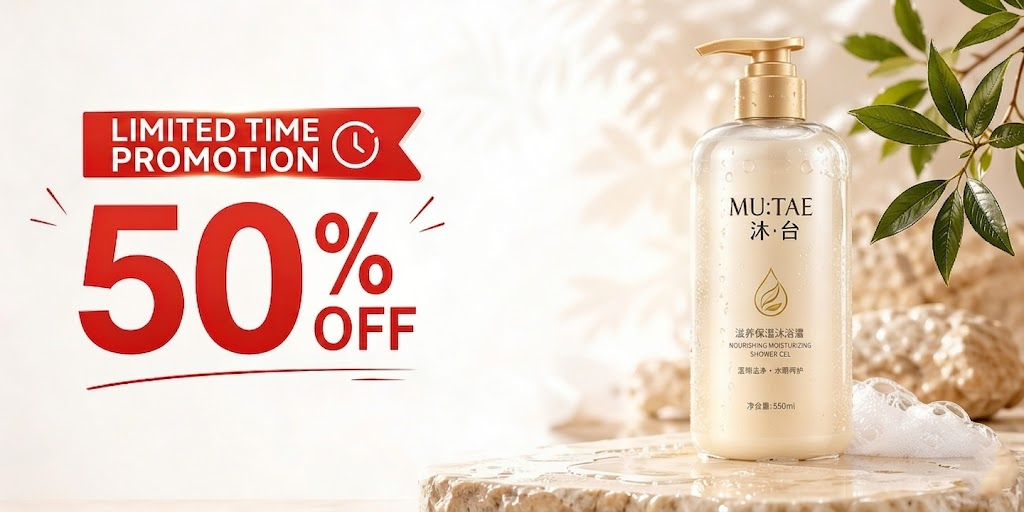 Hasilkan visual promosi e-dagang, produk di kanan, kiri kosong untuk tajuk “Promosi Terhad 50% OFF”, label promosi merah.