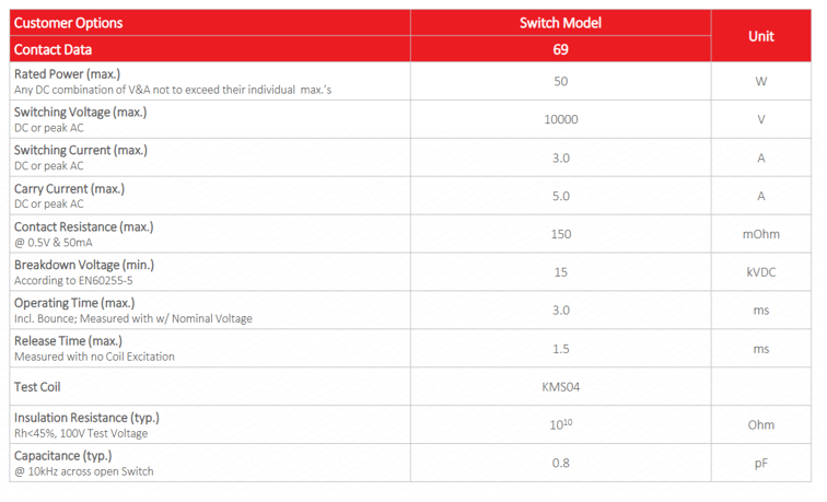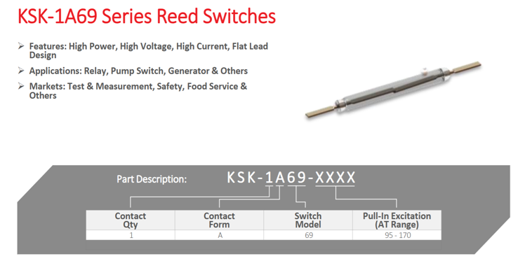 The KSK-1A69 is a high power reed switch and high voltage reed switch with high current capability.