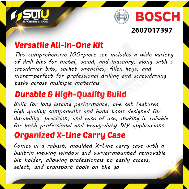 - This compreshensive 100-piece set includes a wide variety of drill bits for metal,wood,and masonry,along with screwdiver bits,socket wrenchs,Allen keys,and more-perfect for professional drilling and screwdriving tasks across multiple materials