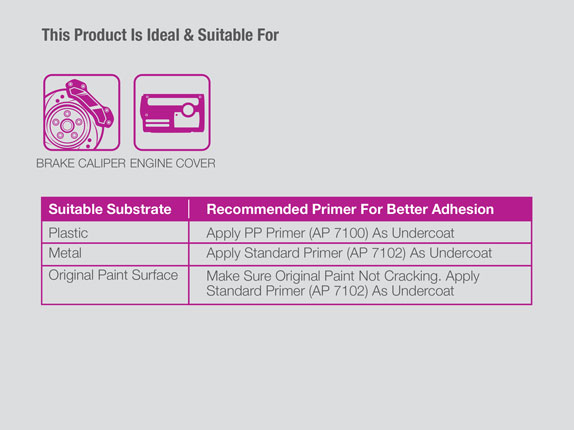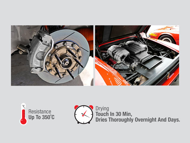 GOX7 Hi-Heat Primer is a specific purpose, fast drying primer ideal for high heat parts and exterior applications, as well as improves adhesion of color basecoat and lacquer topcoat to high heat parts surfaces, such as brake caliper, brake drum, brake rotor centre and ribs, wheel hubs, and engine parts and parts required high heat resistance .
