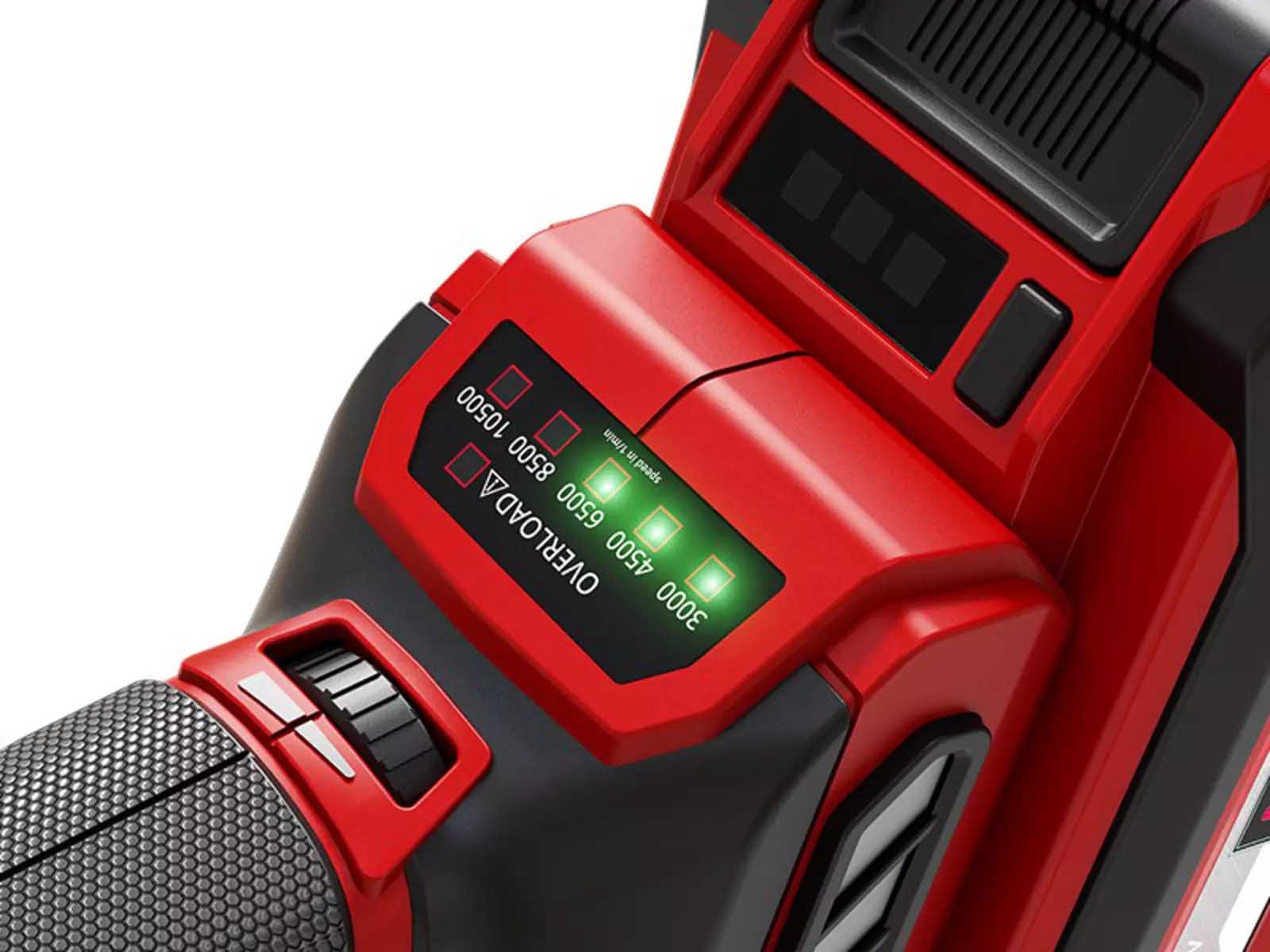 The performance of the Einhell Professional angle grinder TP-AG 18/125 CE Q Li can be flexibly adjusted between 3,000 and 10,500 rpm with the help of speed control. An integrated LED display always provides information about the current speed and optimal use of the device. In addition, the continuous speed electronics ensure consistent performance without speed losses - even under high loads.