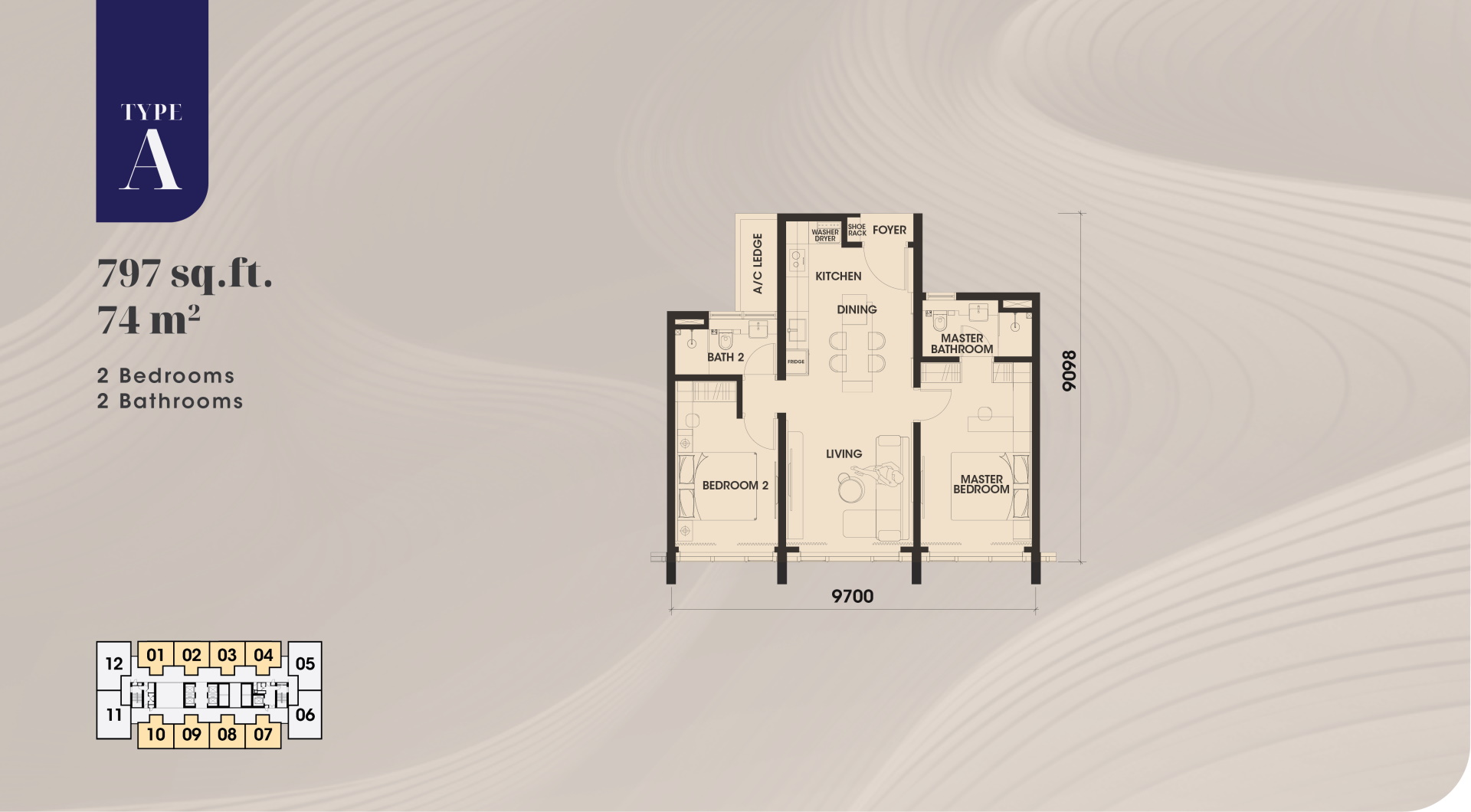 Unit Types | Type A : 2 bedroom ( 797sqft ) - 326 units Type B : 3 bedroom ( 1,140 sqft ) - 228 unit Type C : 4 bedroom ( 1,700 sqft ) - 64 units |