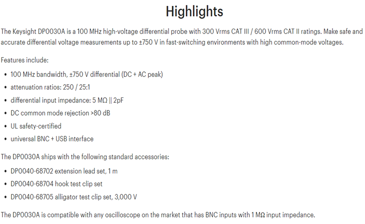KEYSIGHT DP0030A High-Voltage Differential Probe, 100 MHz, 750 V