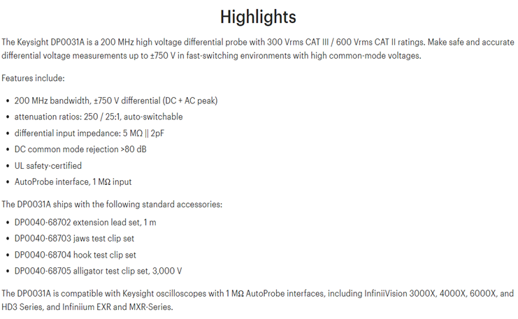 KEYSIGHT DP0031A High-Voltage Differential Probe, 200 MHz, 750 V