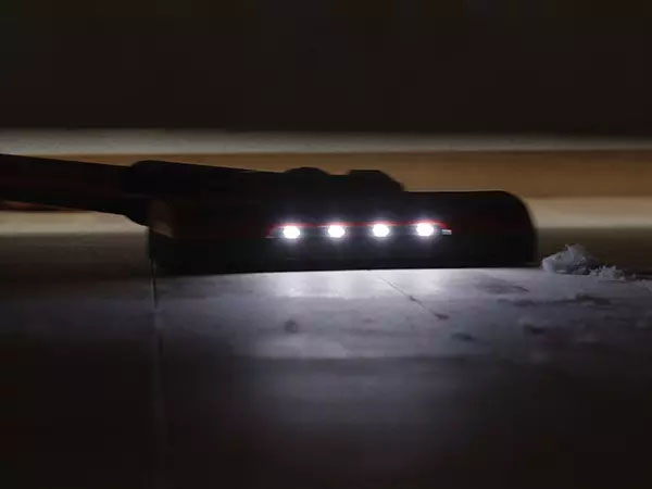 | The four LED spotlights integrated in the brush ensures good visibility in dark areas. This means that even hard-to-reach under the bed or sofa can be perfectly cleaned. | The cordless upright vacuum cleaner works without an additional bag. The dirt is collected in the dust collection container and easily emptied at the push of a button. | Whether tiles, parquet, laminate or carpet - the motorised brush cleans all types of floors without problems and also removes stubborn dirt. | The cordless upright vacuum cleaner is tidied away in a space-saving way and yet always within reach thanks to the supplied wall mount. Various nozzles can also be stored in it. |