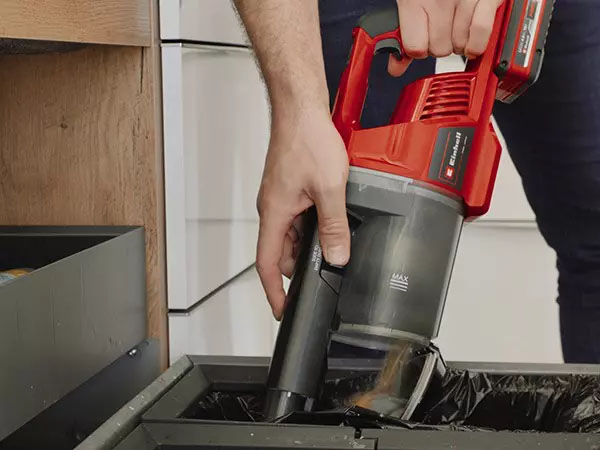Practical, Clean, BaglessThe Einhell cordless vacuum cleaner TE-SV 18 Li Solo is equipped with a practical triple filter system consisting of a pre-filter, a washable pleated filter and a motor filter. An integrated cyclone separator also provides clean exhaust air and high suction power. The filtered dirt is simply emptied at the push of a button - with no need for a bag.