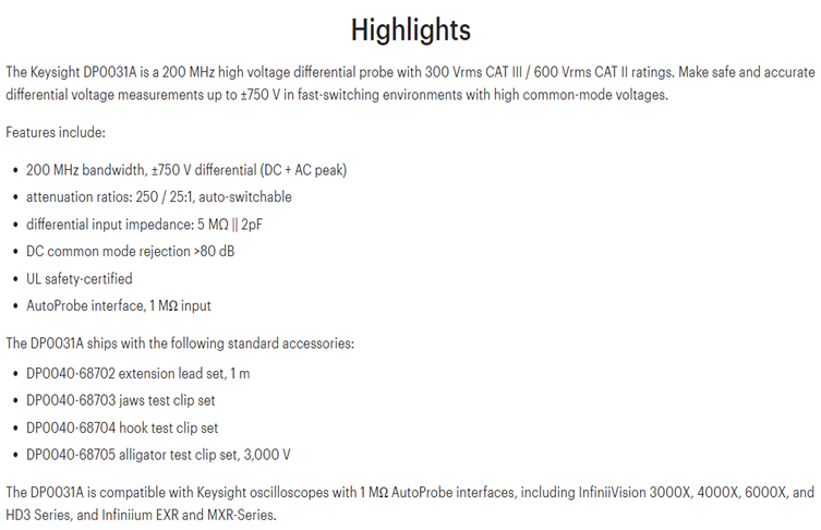 KEYSIGHT DP0031A High-Voltage Differential Probe, 200 MHz, 750 V