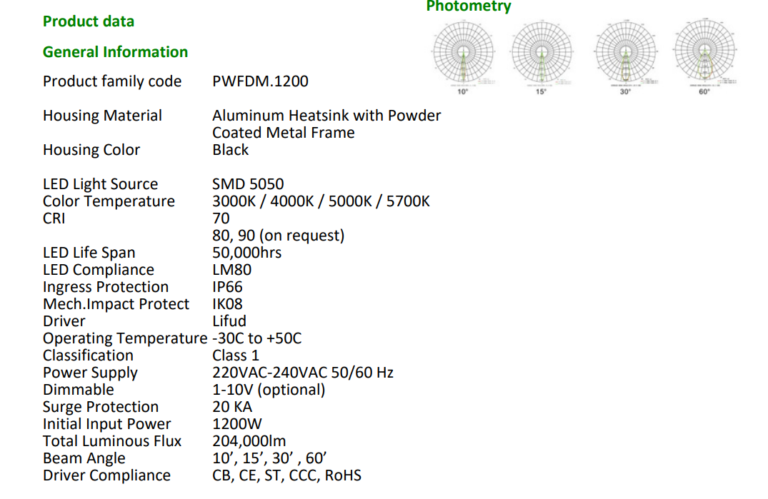 Beam Angle Options: 10°, 15°, 30°, 60°