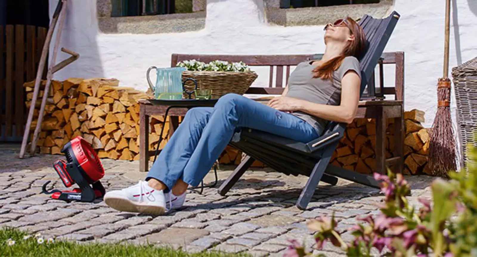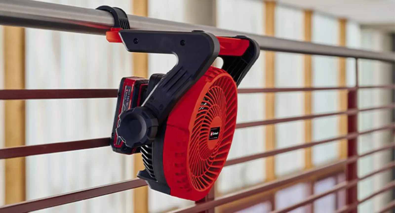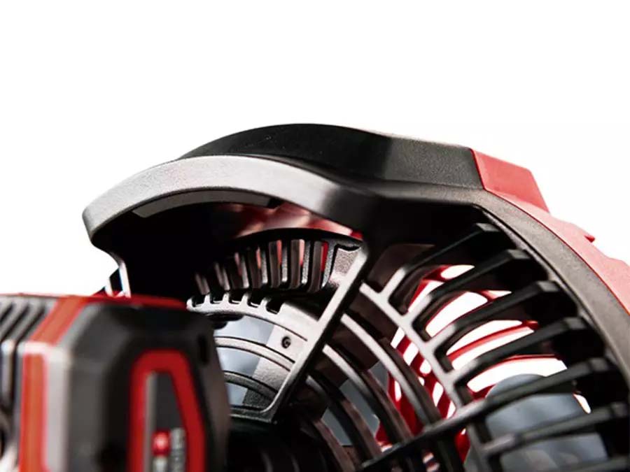 | Air supply from any angle is no problem thanks to the continuously adjustable and 360° rotatable fan head | WIth the aid of the carrying handle on the top battery fan, the device can be transported quickly and easily. | The robust dan is equipped with a large fan wheel with a diameter of 18 cm. That makes for a lot of wind! |