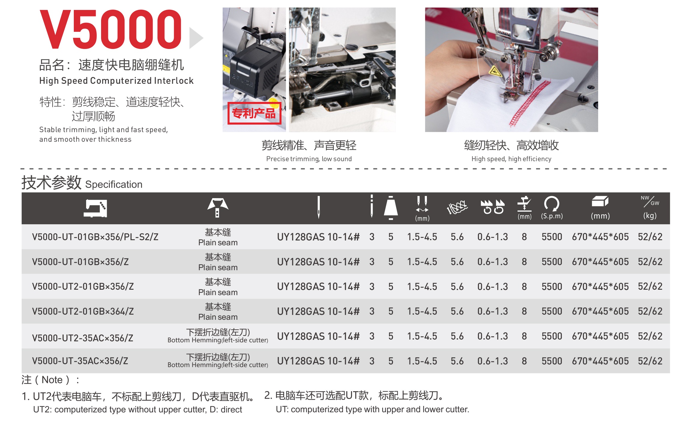 BRUCE/V5000-UT-01GBX356/Z : Mesin Jahit Interlock Elektronik 3 Jarum 5 Benang Jenis Katil Silinder, Dengan Pemotong Benang Automatik, Pengangkat Tapak Tekan Automatik, Lampu LED dan Motor Servo, Set Lengkap