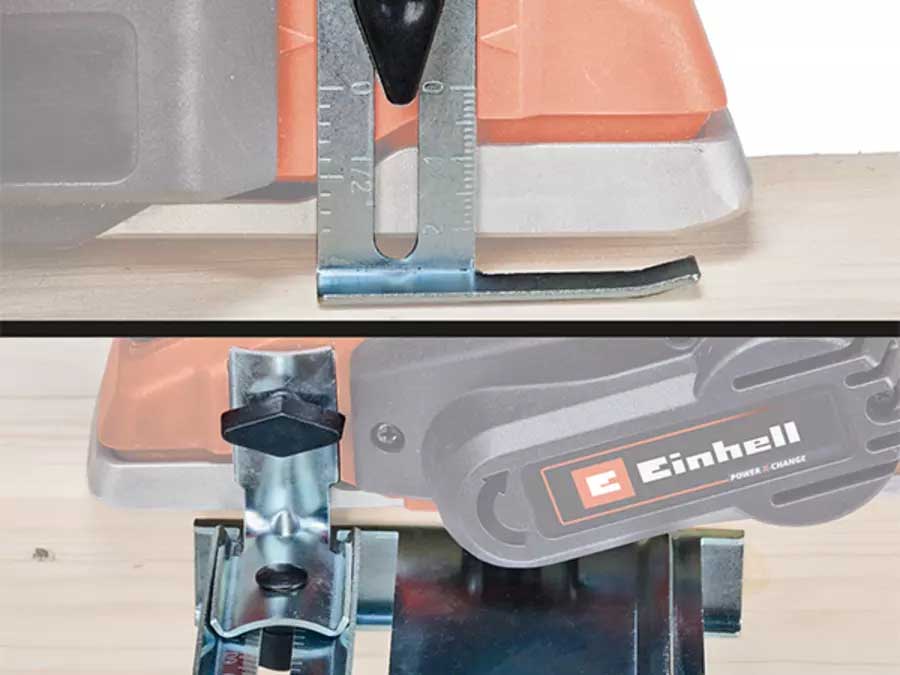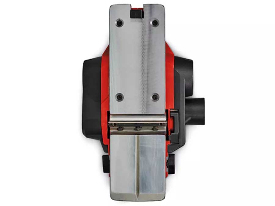 | Workpieces and planers are protected by the automatic parking shoe during work breaks | The solid aluminum base plate guarantees flat work results and is equipped with a V-groove for chamfering edges. | The scope of delivery includes a rip fence exact planing work as well as a folding depth stop for easy production of heels. | Also included is a high-quality TCT planer blade (reversible blade). |