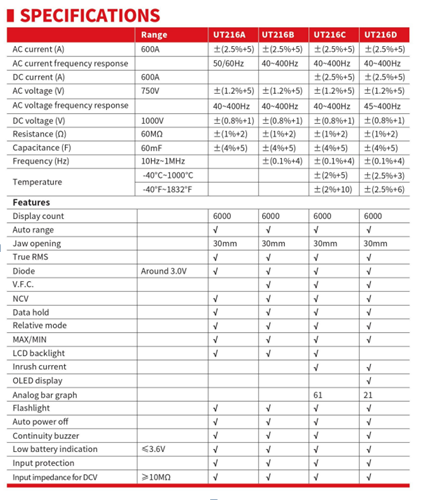 UT216 Series Digital Clamp Meters are designed for measuring high frequency currents (up to 400Hz) in railways and aerospace, server rooms, IT system, etc. Its double injection design gives users a more comfortable grip and enhanced durability. UT216's 6000 count display also provides more prcise readings for user.