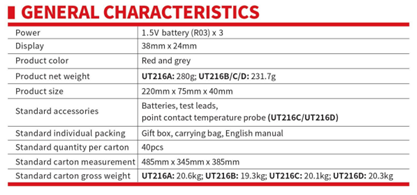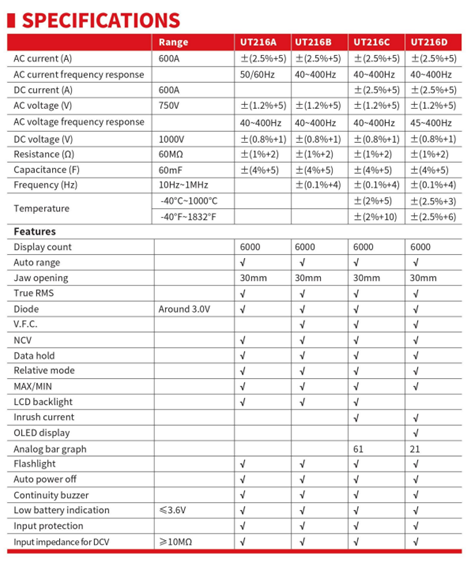 UT216 Series Digital Clamp meters are designed for mwasuring high frequency currents (up to 400Hz) in railways & aerospace, server rooms, IT systems, etc. Its double injection design gives users a more comfortable grip and enhanced durability. UT216's 6000 count display also provides more precise readings for users.