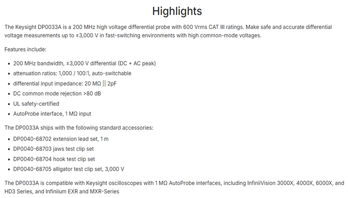 KEYSIGHT DP0033A High-Voltage Differential Probe, 200 MHz, 3,000 V