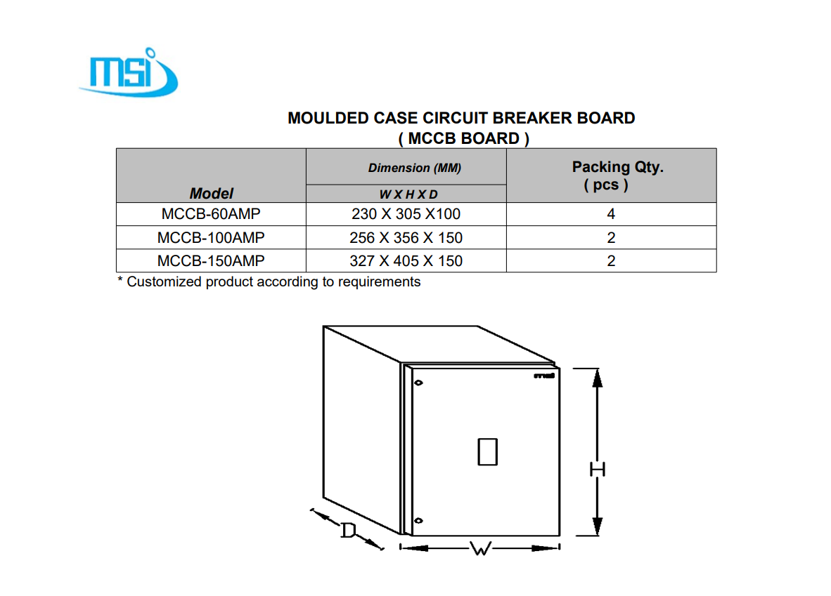 • Product Dimensions (L*W*H): Dimension (MM) Model W X H X D MCCB-60AMP = 230 X 305 X100 MCCB-100AMP = 256 X 356 X 150 MCCB-150AMP = 327 X 405 X 150