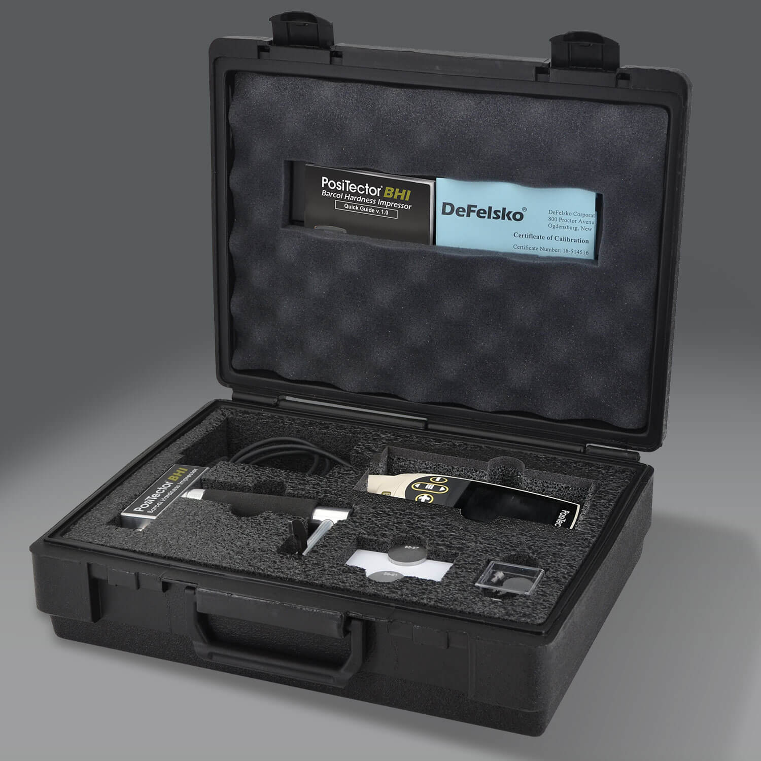 All gages come complete with test disks (2), leveling plate, replacement indentor with replacement tool, glass plate, protective rubber holster, wrist strap, 3 AAA batteries, instructions, protective carrying case, protective lens shield, Long Form Certificate of Calibration, USB cable, PosiSoft Software, two (2) year warranty.