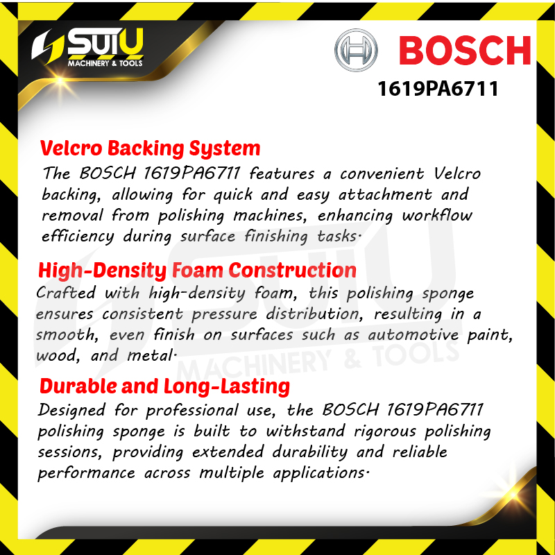 - Designed for professional use,the BOSCH 1619PA6711 polishing sponge is built to withstand rigorous polishing sessions,providing extended durability and reliable performance across multiple applications.