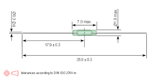 Ultraminiature KSK-1A80 Series reed switch featuring a close differential and glass length of 7.0mm and diameter of 1.8mm. Rated power 10 W, Switching voltage 170 VDC, Switching current 0.5 Amp DC. Most used, UL approval.