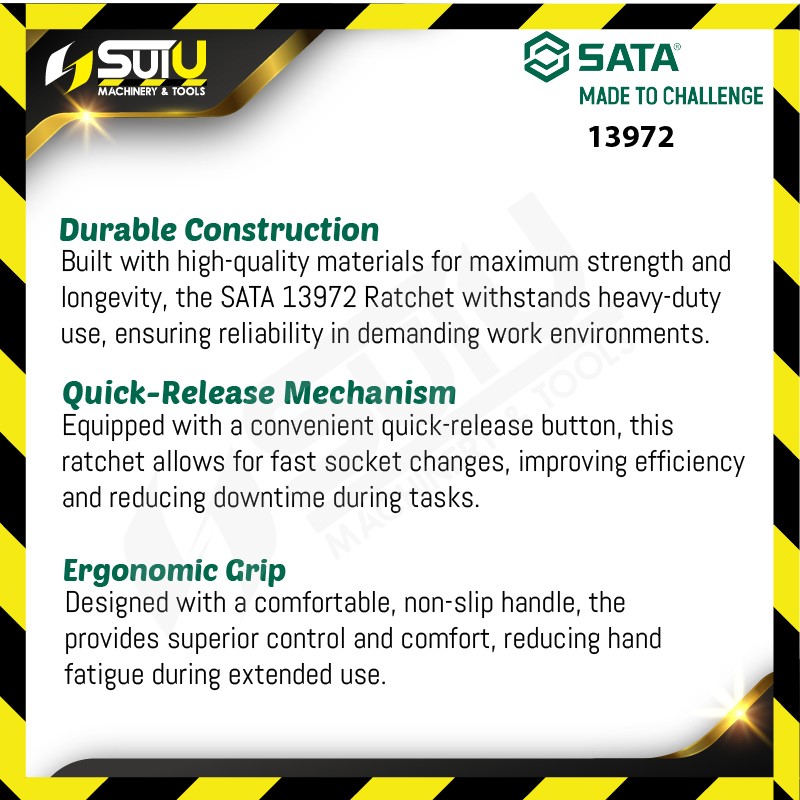 - Built with high-quality materials for maximum strength and longevity, the SATA 13972 Ratchet withstands heavy-duty use,ensuring reliability in demanding work environmenys.