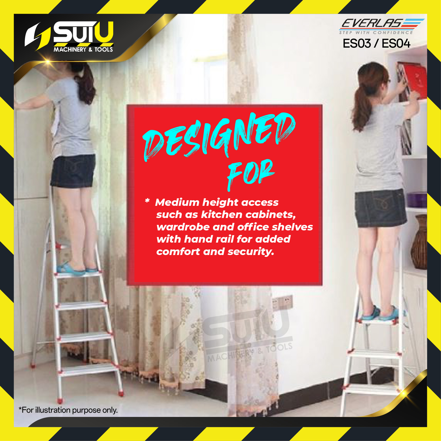 - General household application, medium high access such as kitchen cabinets, wardrobe and office shelves with hand rail for added comfort and security