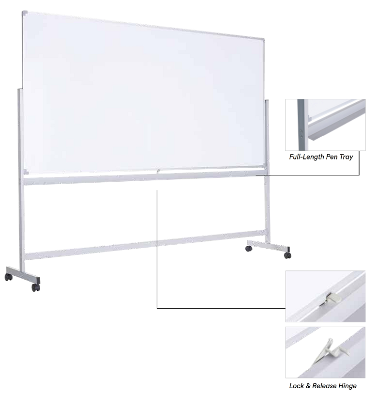 The Ziko Board is a premium double-sided mobile whiteboard designed for flexible workspaces, classrooms, training rooms, and offices. Built with E³ CeramicSteel or coated steel surfaces, it rotates 360° for easy switching between sides. The lock & release hinge secures the board in place during use, while the full-length pen tray keeps markers and accessories organised. Mounted on a durable aluminium stand with castors, the Ziko Board combines stability with mobility, making it ideal for brainstorming, teaching, and presentations in any professional or educational environment.
