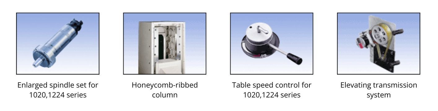 •Enlarged column and base create high stability and rigidity. The height of column is increased up to 18'' (460mm) from table surface to the center line of spindle.