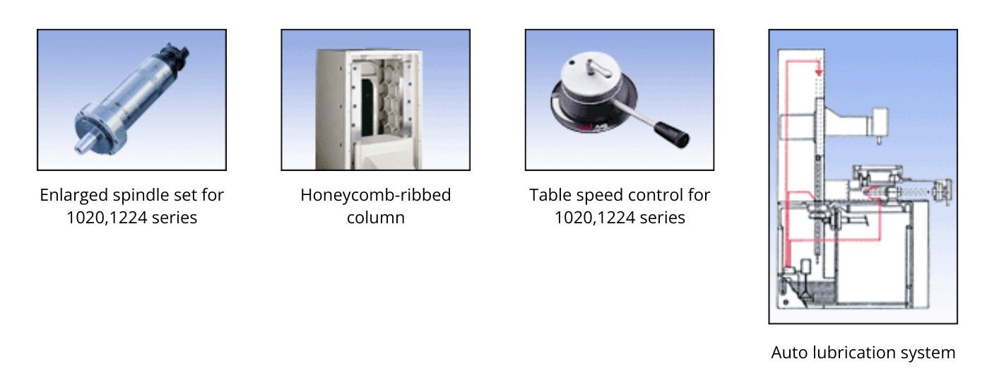 •Enlarged spindle set is supported by four preloaded precision angular contact ball bearings for heavy duty.